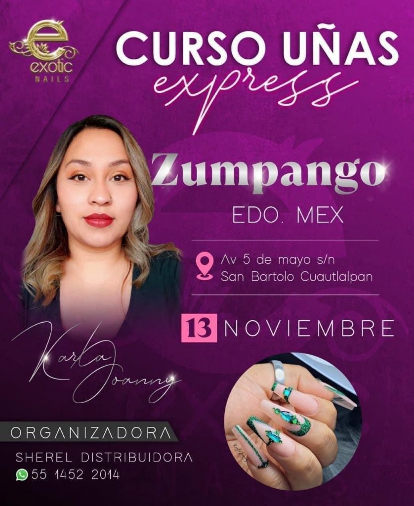 PRÓXIMOS CURSOS Curso Uñas ExpressImpartido por Karla Joanny.Fecha: 13 de Noviembre de 2022.Lugar: Av. 5 de Mayo S/N, San Bartolo Cuautlalpan.Organizadora: Sherel Distribuidora Inscribirse Informes